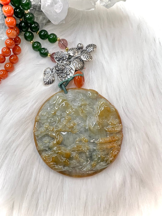 Burma Jade Pendant | Hand Carved Multicolored with Beaded necklace and 925 Silver Charm | Healing and Prosperity
